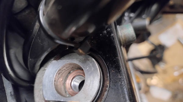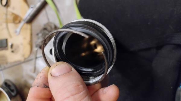 Po rozebraniu, trzeba wyjąć uszczelniacz z aluminiowej rury. Uwaga, jest on zabezpieczony stalowym pierścieniem, który zapobiega jego wysunięciu. Trzeba więc najpierw wyjąć pierścień a dopiero później podważyć uszczelniacz np śruborkętem: